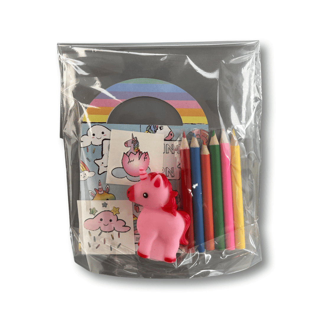 - Compleet: bestaande uit een kleurboekje, potloodjes of wasco, 2 stuks tattoo en een speeltje ( unicorn )